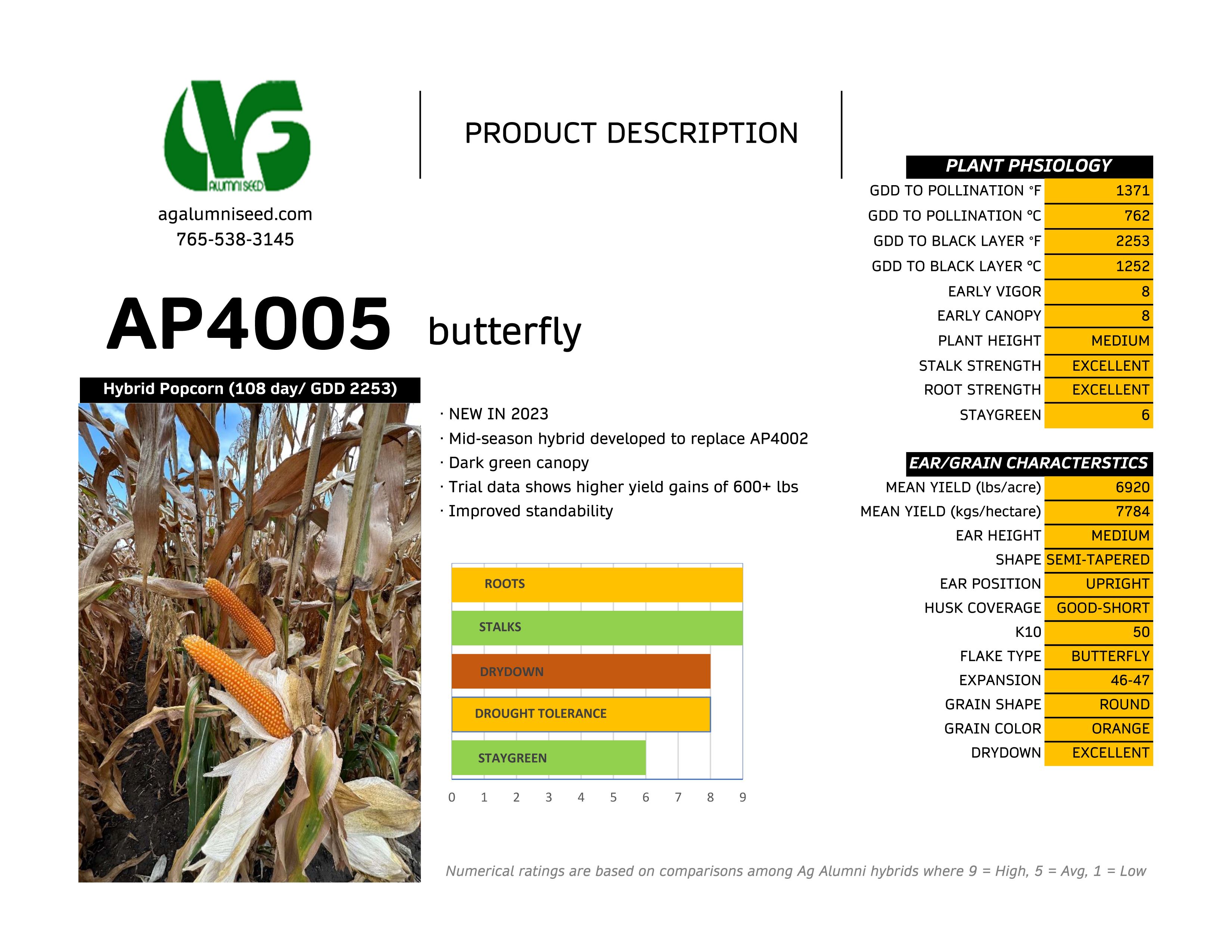 - AP4005 – A very large kernel, mid-season butterfly hybrid. 46-47 cc/g COMMERCIAL QUANTITIES AVAILABLE NOW.