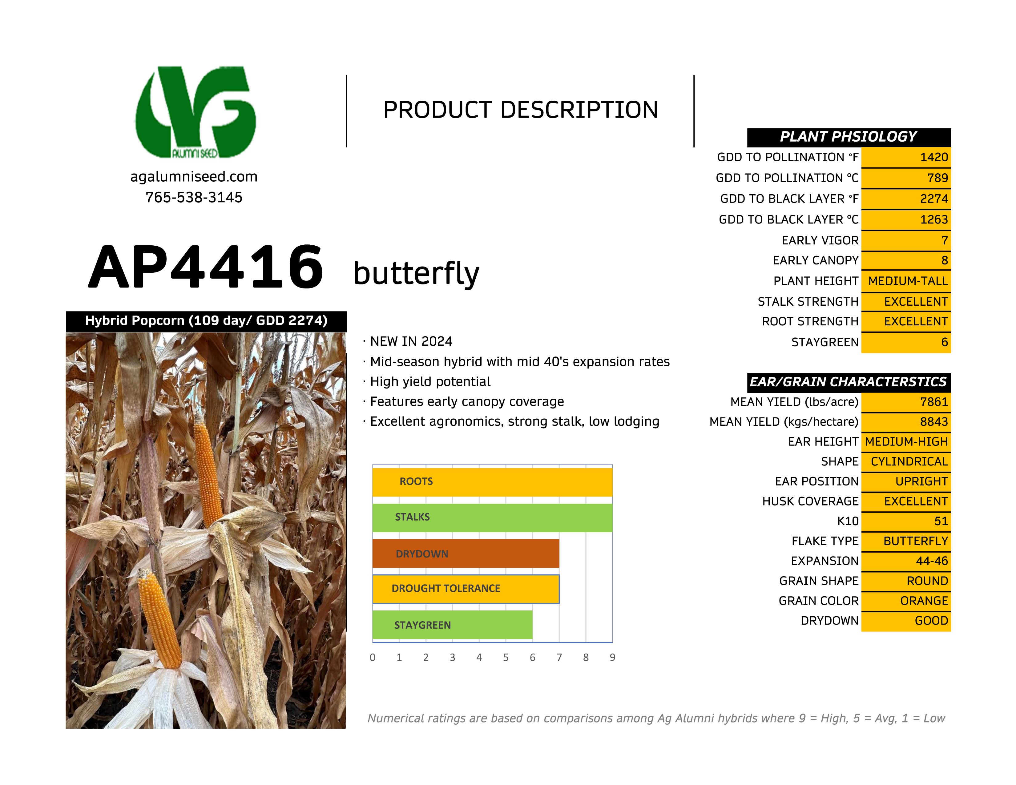 - AP4416 – A large kernel, mid-season maturity butterfly hybrid. 44-46 cc/g. TRIAL QUANTITIES AVAILABLE NOW.